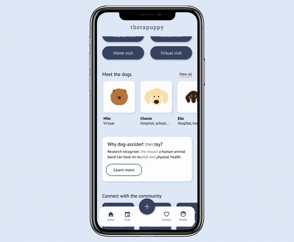While a fully developed version of Therapuppy would likely include real photos of each therapy dog, hand-drawn illustrations added a warm, playful touch to the presentation, reinforcing the experience’s friendly and inviting nature. These digital illustrations helped to establish an emotional connection between users and the therapy dogs they could book.