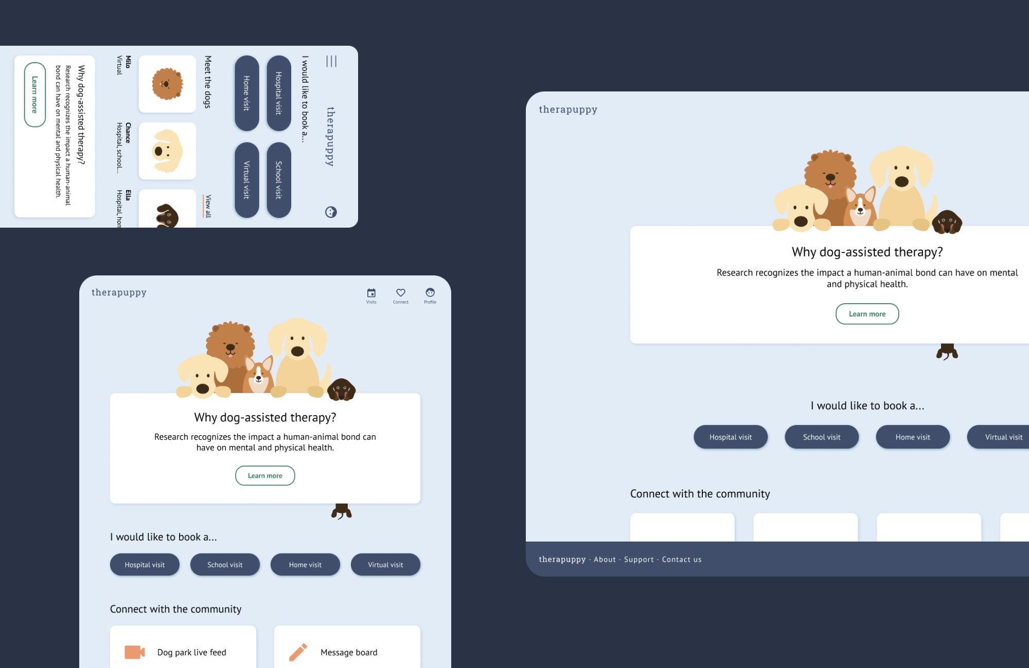 The high-fidelity prototype refined user flows, ensuring a seamless experience for booking therapy dog visits while maintaining clear, user-friendly navigation.