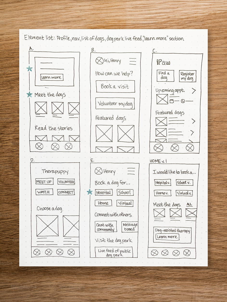 Using the Crazy Eights ideation technique, I “unleashed” my creativity to explore ways I could make therapy dogs more accessible, ensuring every wag and cuddle reaches those who need it most. I focused on enhancing engagement with the dog-therapy community and showcasing its benefits prominently.