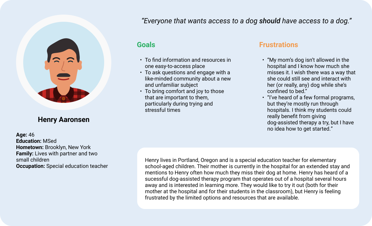 To better understand the audience, I developed user personas. Henry is a caregiver and teacher who needs an easy way to access therapy dogs in their community.